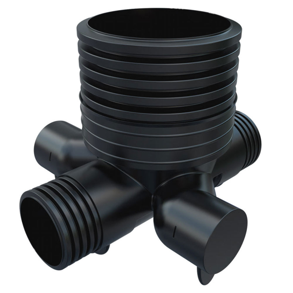 The Accesso range of 600mm Inspection Chambers from Turtle Enviro has several pipe connection options. These models have Twinwall main-channel rocker pipe connections, with two further optional side inlets. The side inlets are moulded blanked, which can easily be opened and fitted with Twinwall rocker pipes, or a wall seal can be used to achieve 110mm or 160mm smooth pipe connections.
