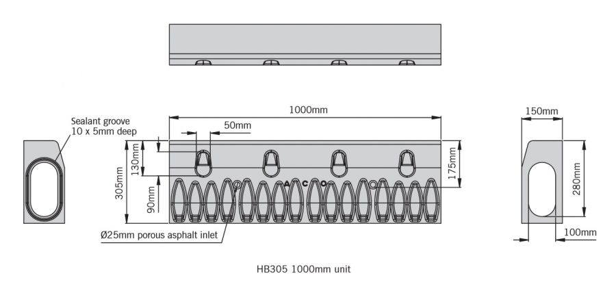• 1000mm length x 150mm width x 305mm depth and 280mm invert