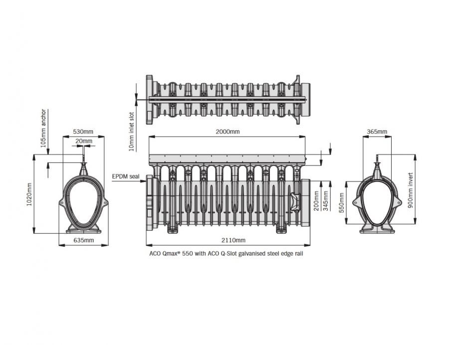Qmax® 550 channels are available with a range of components such as installation edge rail protectors, access, outlet/inlet and silt chambers, Q-Brake Vortex flow controls and outlet/inlet and closing end caps.