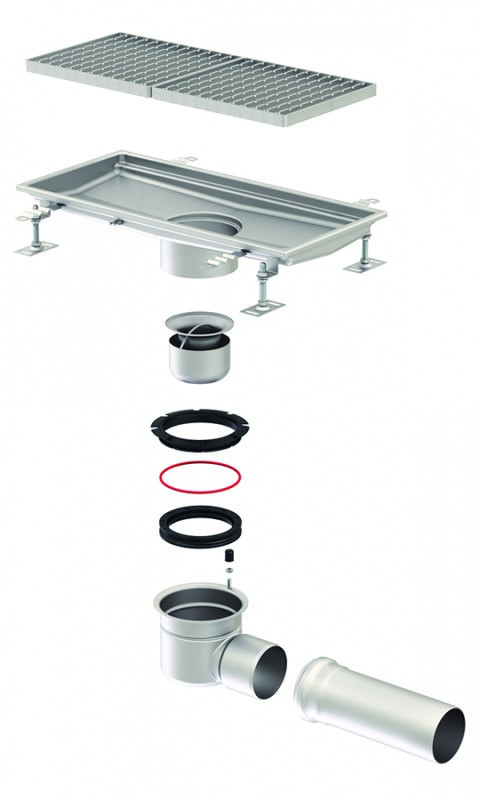 For use with tiled floors with thin bed installation, this Kitchen Tray Extended Edge Channel has a drainable sump, concrete fixing anchors for secure installations, and adjustable levelling feet ranging from 60mm to 110mm. It is compatible with food and drink manufacturing, pharmaceutical manufacturing, commercial kitchens, healthcare facilities and hygiene-sensitive applications, and is equipped with a waterproof membrane to connect to ACO 218 Gully bodies.