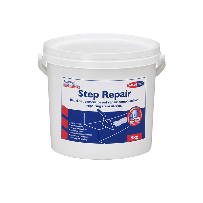 Adawall's Step Repair, a cementitious repair compound designed to repair steps in 30 mins, this is easily workable and can be applied horizontally and vertically. This requires mixing with clean water and can be used internally and externally.
