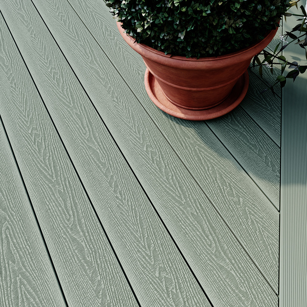 The beautifully delicate green tones within the Sage decking board make it a stunning choice for outdoor areas flooded in natural light and surrounded with lush and vivid earthy natural tones. The Sage decking board will provide an elegant and stylish accompaniment to your garden's natural features, from whitewashed walls to immaculate garden lawns.