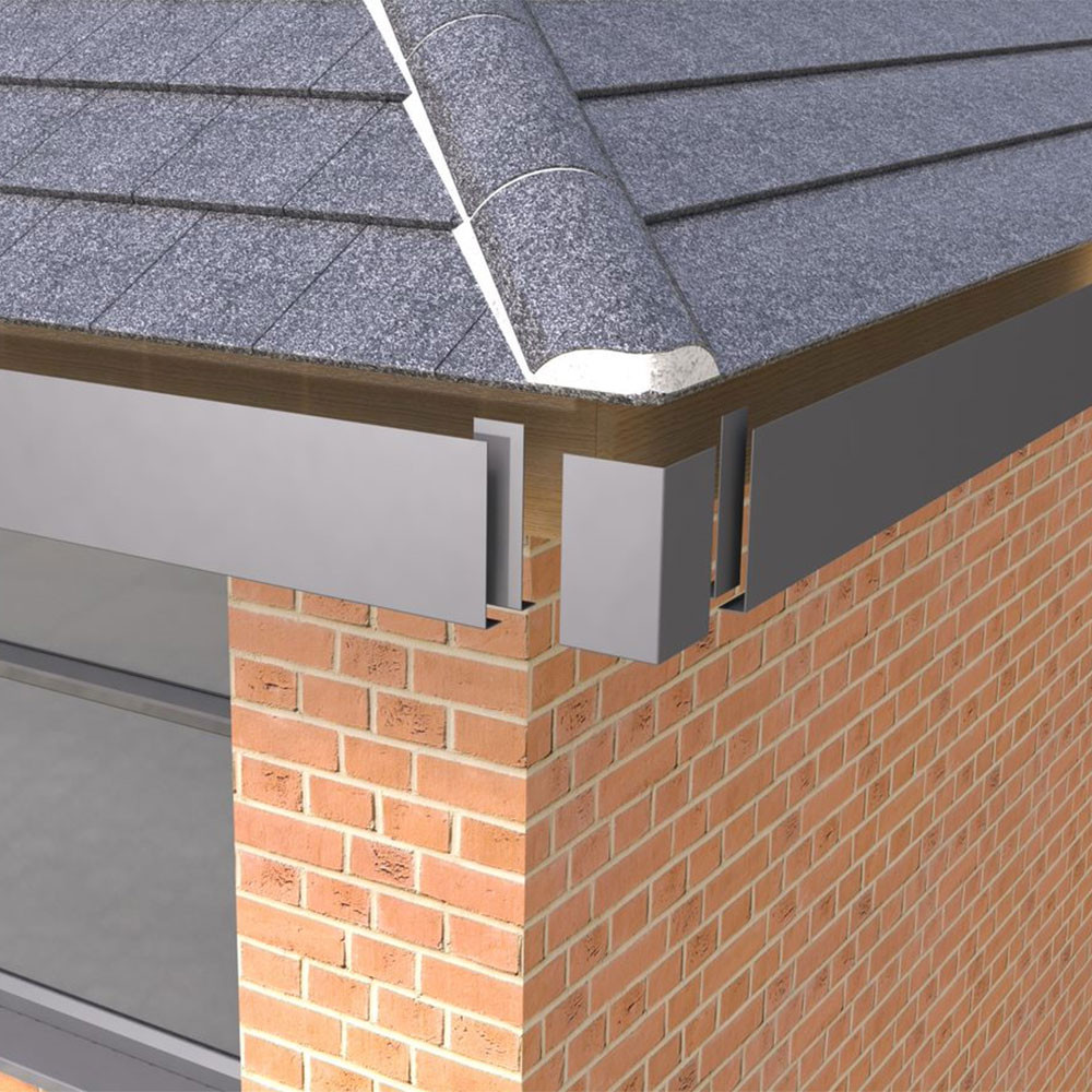 The powder-coating aluminium enables a clean-cut mitred join with each section, completing those ever-popular ultra-modern lines. In addition, these fascia profiles fully enclose the gutter and can be projected directly from the elevation or combined with the soffit plan for varying eaves overhangs.
