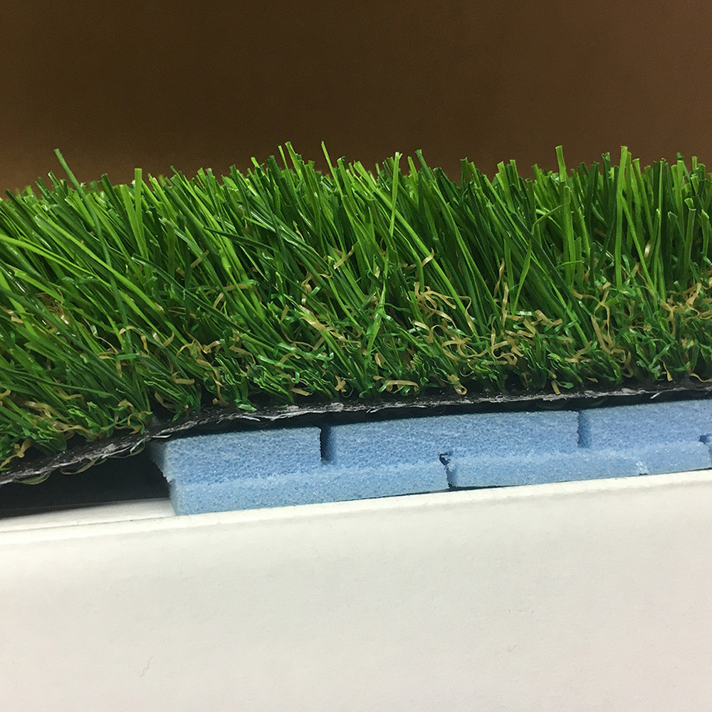 The underlay can be finished short of the grass to allow for glueing/fixing of the grass over the underlay on to the surface. This also prevents a trip hazard.