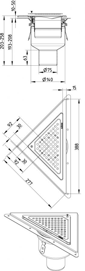 Please Note Trap Purchased Separately ADJUSTABLE SHOWER DRAIN TRIO - Corner - Floor: concrete and tiled - Sheet membrane, frame: triangular - Outlet: Ø75mm, vertical - Stainless steel: AISI304/EN1.4301 Read More