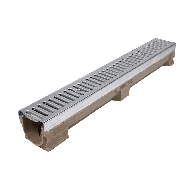 Channel & Grate : Polymer concrete with galvanised steel edge rails. Knockout section for vertical outlet (optional). Locking bar slots. 1 x 1mtr galvanised steel slotted grate.