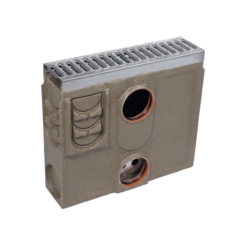 Channel & Grate: Polymer concrete with galvanised steel edge rails. Multiple knockout sections and blanking caps offering a variety of inlet and outlet options. Locking bar slots. 1 x 500mm galvanised steel slotted grate.