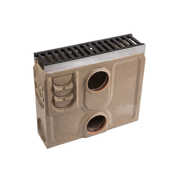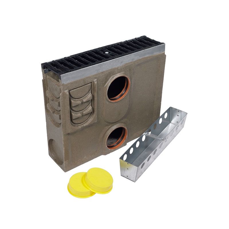 Channel & Grate: Polymer concrete with galvanised steel edge rails. Multiple knockout sections and blanking caps offering a variety of inlet and outlet options. Locking bar slots. 1x 500mm ductile iron slotted grate.