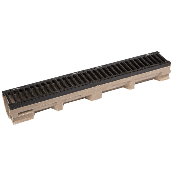 Channel & Grate: Polymer concrete with ductile iron edge rails. Knockout section for vertical outlet (optional). 2 x 500mm ductile iron slotted grates.