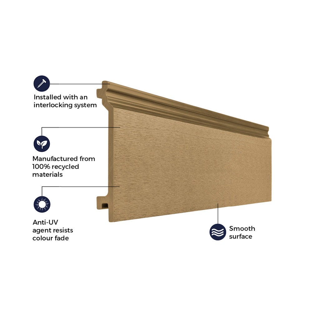 Cladco Composite Cladding can be fitted horizontally or vertically. When installing Cladco Composite Cladding, it is recommended that you use battens made from composite material to maximise the long term performance of your cladding. Attach a Cladco Wall Cladding Starter Strip to the bottom of each joist before slotting the first cladding board into place. Create a high end finish for your cladding project by using Cladco Corner Trims and Cladco Skirting Trims.