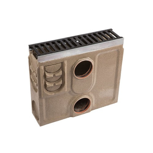 Channel & Grate: Polymer concrete with galvanised steel edge rails. Multiple knockout sections and blanking caps offering a variety of inlet and outlet options. Locking bar slots. 1x 500mm ductile iron slotted grate.