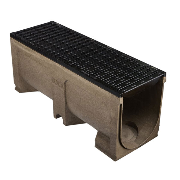 Channel & Grate: Polymer concrete with ductile iron edge rails. Knockout section for vertical outlet (optional). 2 x 500mm ductile iron slotted grates.