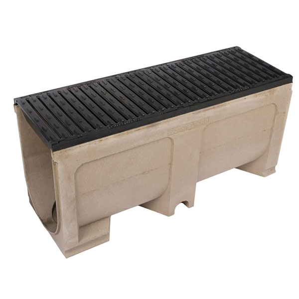Channel & Grate: Polymer concrete with ductile iron edge rails. Knockout section for vertical outlet (optional). 2 x 500mm ductile iron slotted grates.