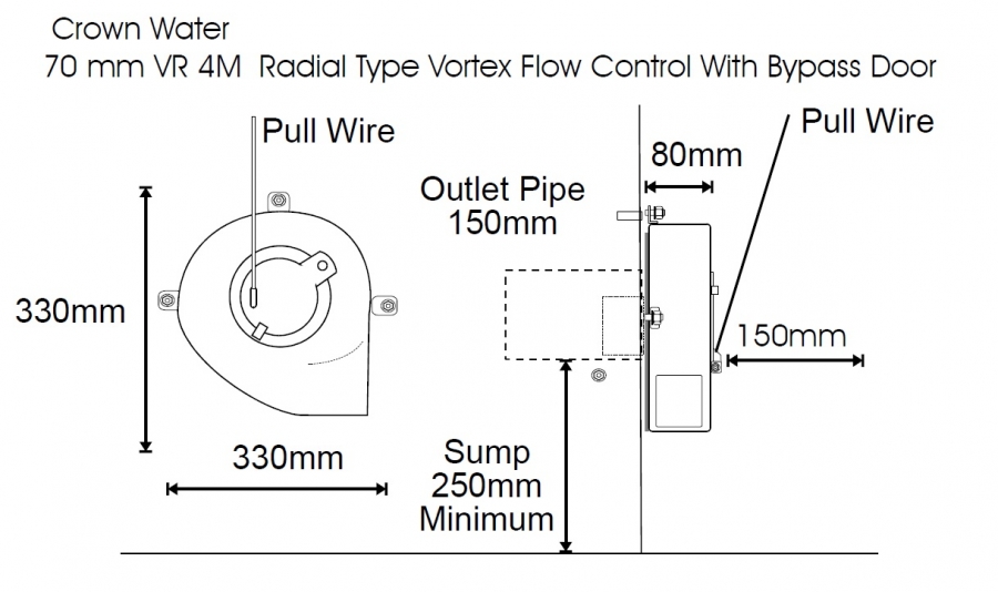 Crown 70mm VR4M Radial type Vortex Flow Control Unit, to suit a 150mm outlet pipe. Design Flow 2 l/s Design Head 0.5. Grade 304 Stainless Steel. Emergency bypass valve and operating cable included. Fixings also included. Read More