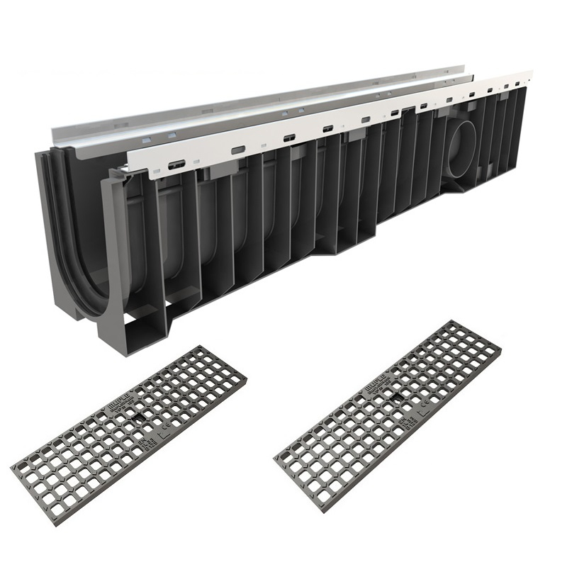This B125 channel drain from Dek-Drain is manufactured from high density polyethylene for use in areas where traffic will not exceed the weight load class of 12.5 tonnes. This Dek-Drain channel drain can be used in areas such as pavements, private car parks and laybys. 2.4mm galvanised edge rails provide an extra reinforcement for added strength.