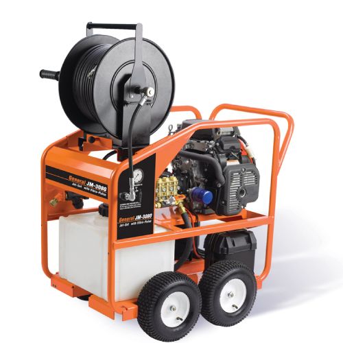 Includes basic unit of 614cc engine w/electric start (battery NOT included), 3000 psi/8 gpm pump with Vibra-Pulse®, 300 ft. capacity hose reel, 12 gallon holding tank, spray wand PLUS 250JH2 (250’ x 3/8”) hose, JN110 nozzle set, NCT nozzle cleaning tool. The JM-3080 gives you the increased cleaning power of 8 gpm without risking pump damage if your water supply can’t match the pump demand. A 12 gallon buffer tank gives you the safety margin you need when using a high flow water jet to clear larger and more difficult lines. A 614 cc Honda engine with electric start drives a 3000 psi pump through a 2 to 1 gear reducer.