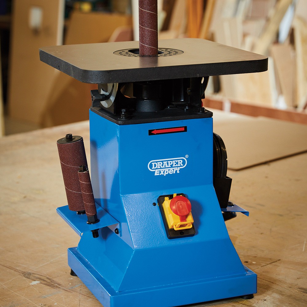 This sander has rotating and oscillating action for increased speed and efficiency, making it ideal for precise finishing of intricate work. There is a large cast iron table for stability and enhanced material support. It can be tilted to 45 degrees to help with precision sanding. This sander can be bench mounted or used floor standing, and there is a compatible stand (Stock No. 98428 â€" available separately). To help keep the work environment cleaner and safer, there is a 50mm outlet port located at the rear of the sander for dust extraction. Onboard storage keeps accessories such as drums and table inserts neatly to hand. The power switch has a dust cover for ease of use and trouble-free performance. For operational safety, there is a no-volt switch and emergency stop button. It is supplied with three sandings sleeves and drums: 50 x 140mm, 38 x 140mm, 19 x 90mm. There are also six table inserts, offering a selection of round and oval cutouts.