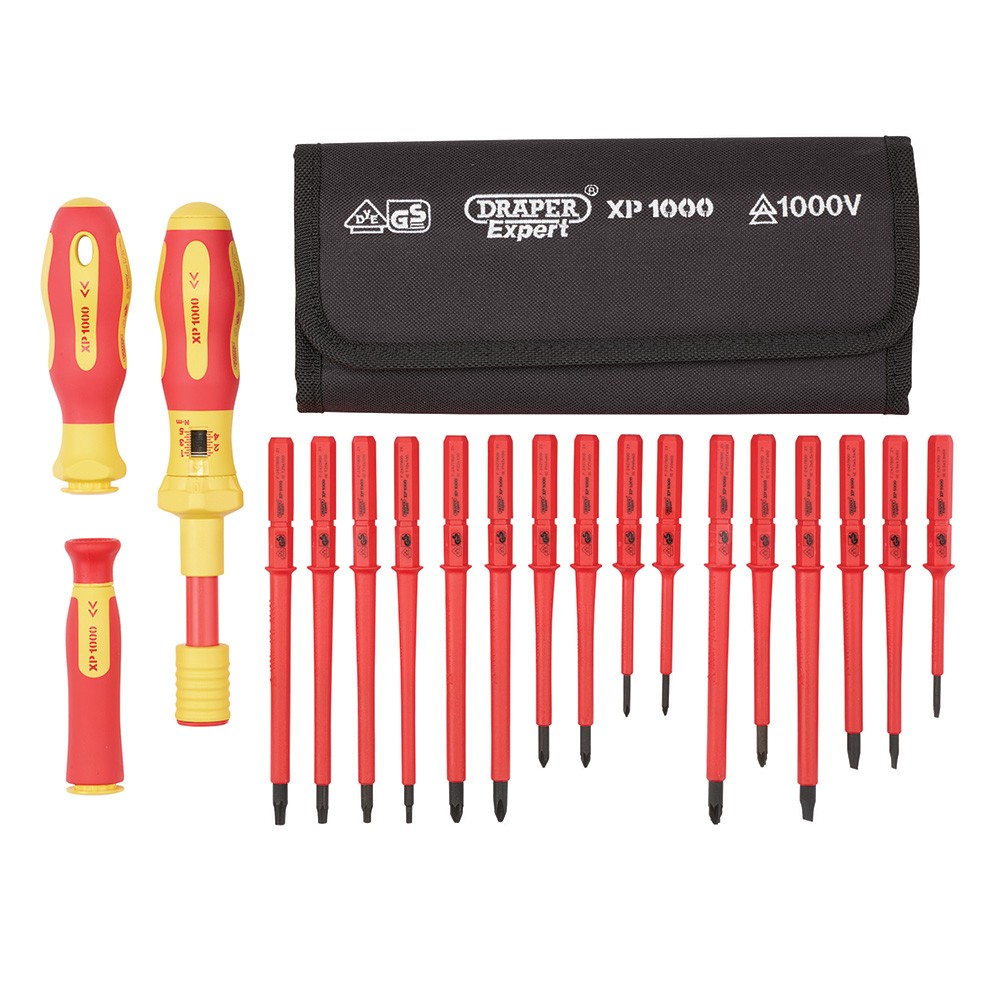 Find out moreExpert quality XP1000®, interchangeable VDE torque screwdriver with a selection of 19 commonly used screwdriver tipped blades for electrical applications. Perfect for torque-controlled tightening of screws, which helps avoid damaging screws and tools while ensuring a safe and secure screw connection. The adjustment scope for the torque screwdriver is 1.0â"5.0Nm (accuracy ±6%). The handle and blade sleeve is moulded in two pieces, enabling the blades to be fitted deep into the handle ensuring there's no "flashover". Ergonomic soft grip bi-material handle allows free spinning in the palm of your hand to quickly tighten screws, but also allows transfer of torque when needed. Designed with flat sides to prevent them from rolling. Individually tested to 10,000V, suitable for working on live circuits of 1,000V AC and 1,500V DC. The VDE interchangeable blades are made from SVCM steel for added strength and deliver a fast and easy press-in auto lock action with a simple release method. Additional standard non-torque and precision screwdriver handles allow complete versatility with one set. Supplied complete with calibration certificate and in a convenient canvas roll for secure transportation and storage.