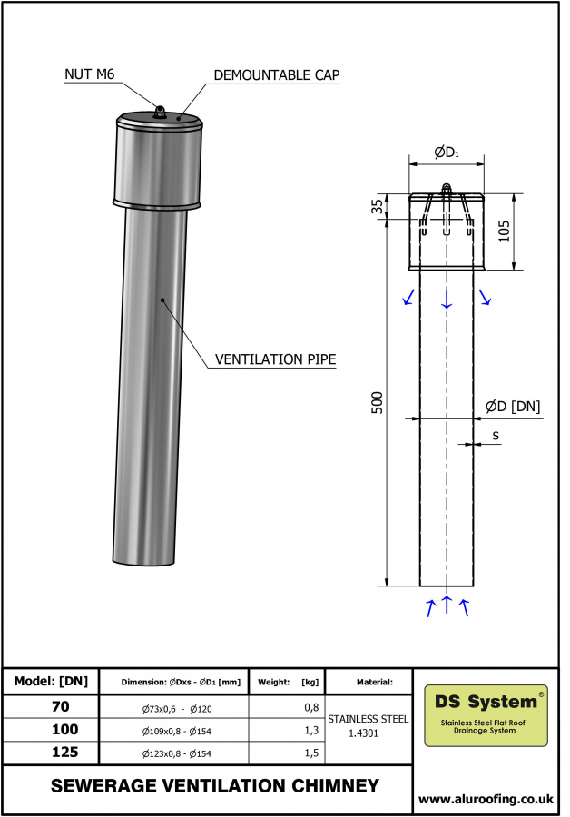 Manufactured from stainless steel for durability and a long life, even in aggressive environments, DS System’s sewerage ventilation chimney is combined of two parts. The main pipe and the lid are secured together by stainless steel bolts and this product is compatible with HT and KG drain pipes.