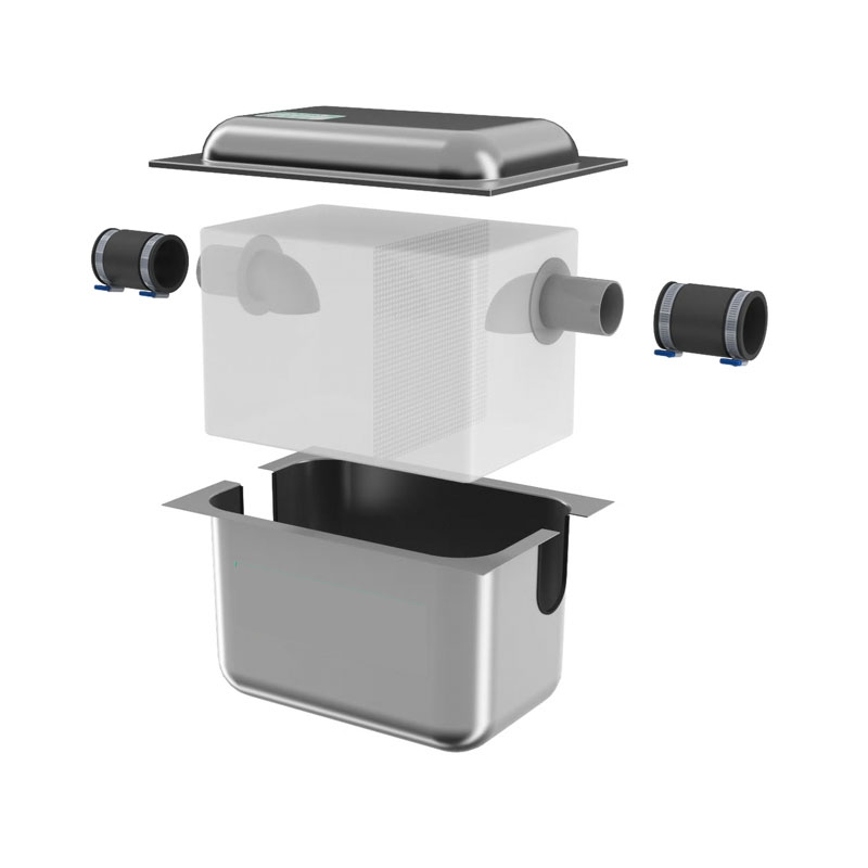 The G-Bag Grease Trap system is suitable for kitchens serving an average of up to 120 meals per day with 1 to 2 commercial sinks discharging through the grease trap. Designed for above ground in-kitchen installation the unit is supplied complete with 2 x 50mm flexible connector seals which can be connected easily to most waste pipes. G-Bag replacement is recommended at up to 4 month intervals depending on kitchen wash up practice and volume of meal service. For larger kitchens and flows the G -Bag traps can simply be connected together as shown above.