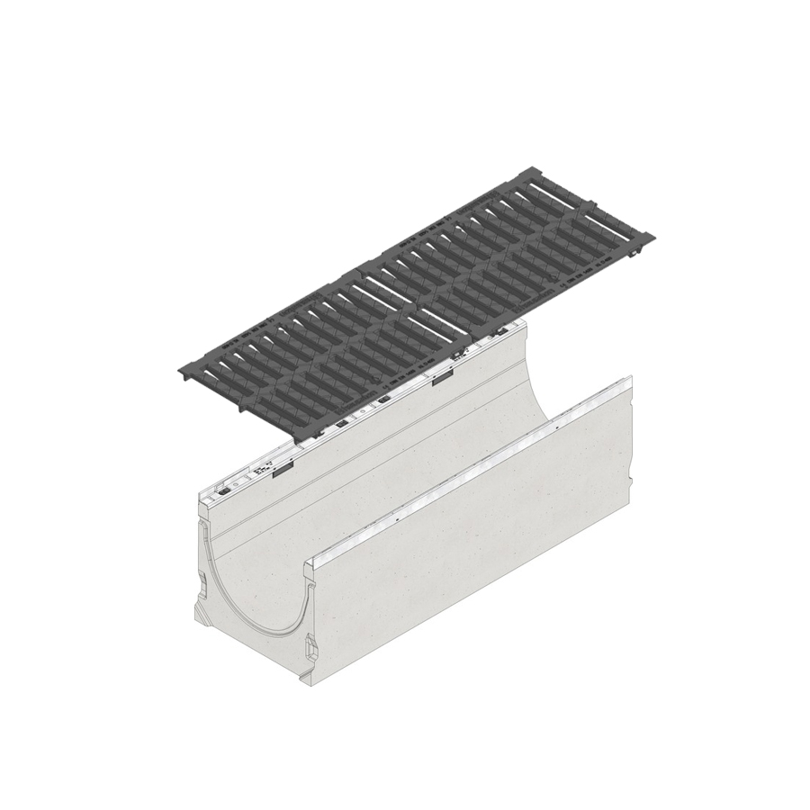 Suited to up to F900 loading, KS300 channel bases rely on grates for exact load classes. Depending on the grate chosen, the channel can be compatible with railway platforms, pedestrian zones, industrial buildings, sewage plants, school yards and more.