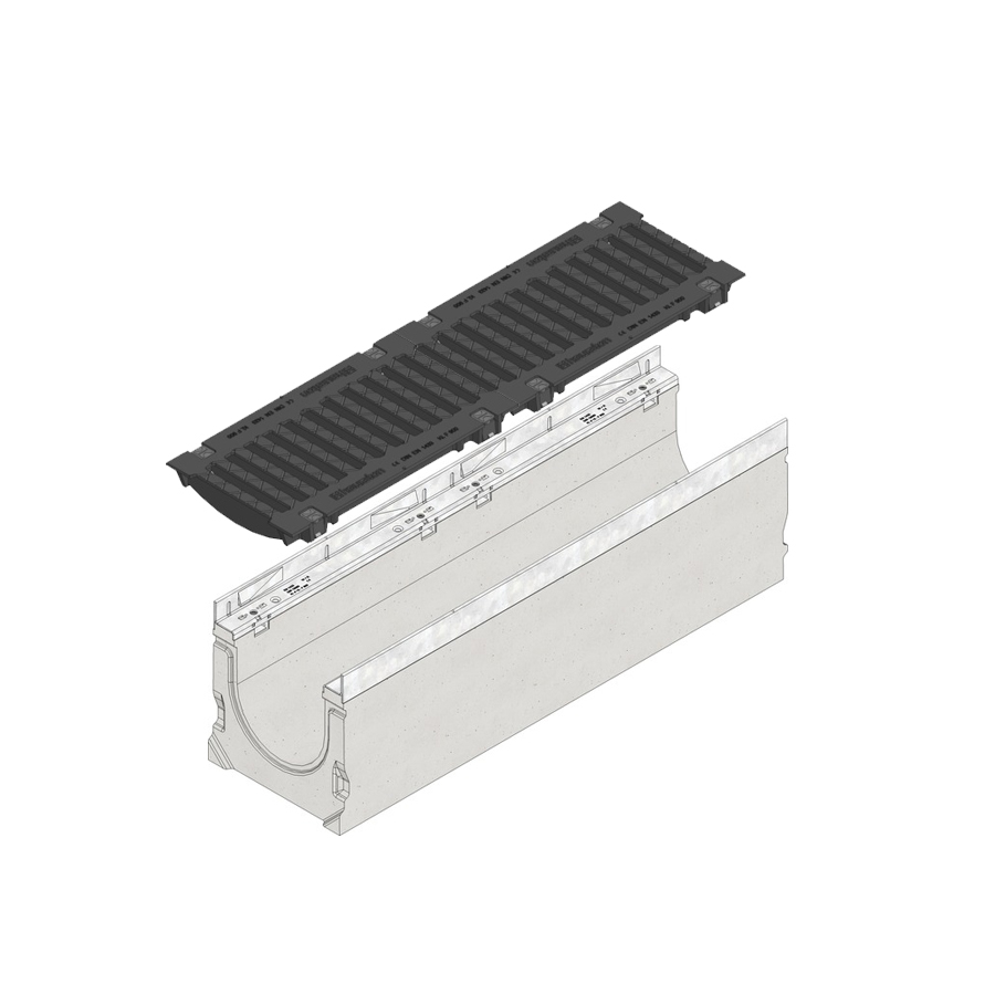 Featuring a fibre-reinforced concrete base, this Hauraton Faserfix SUPER 200 channel provides structural support for dynamic forces and extreme loads thanks to the thick channel base walls. With one F900 channel base and F900 bolted ductile iron slotted grating, this channel can suit your specific weight load requirements.