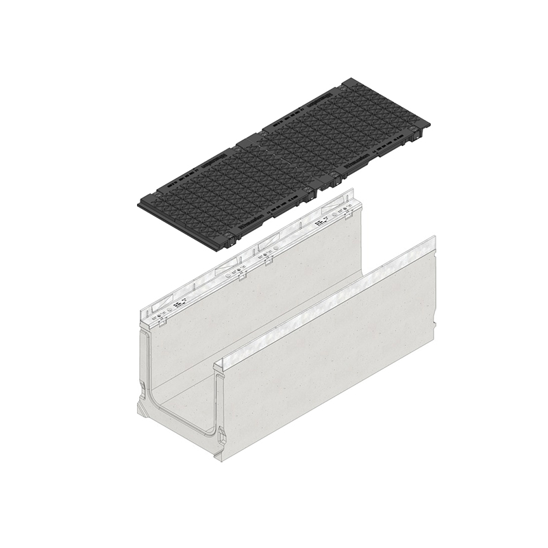 • Fibre-reinforced concrete channel body with galvanised steel angle housing and a boltless quick-locking system