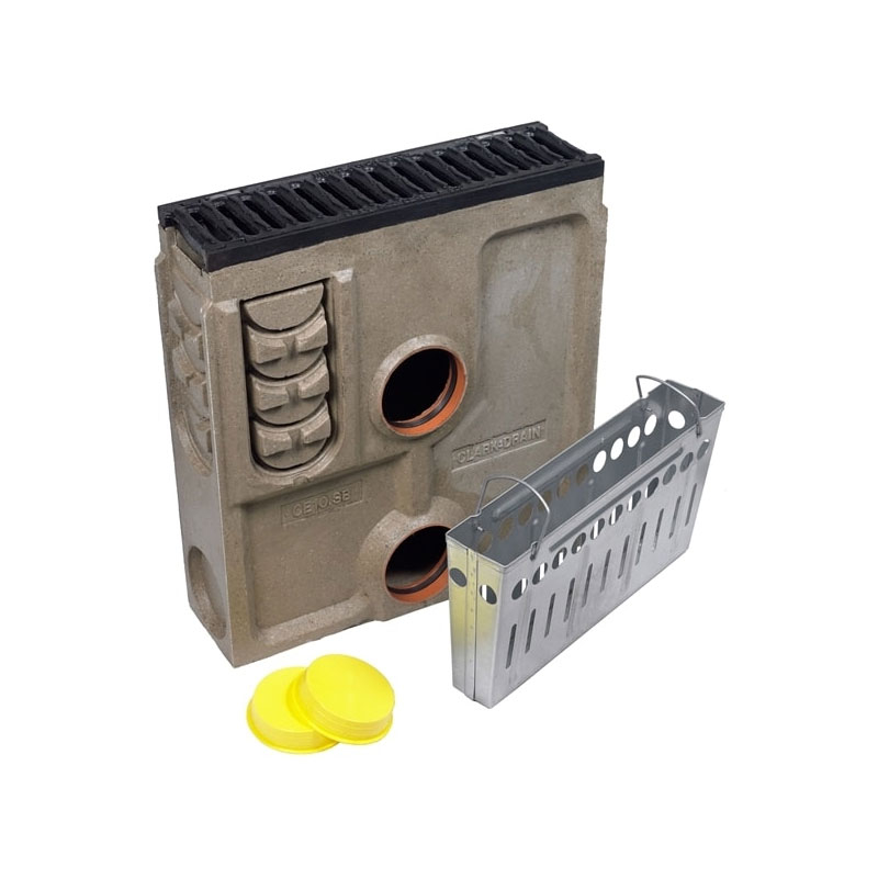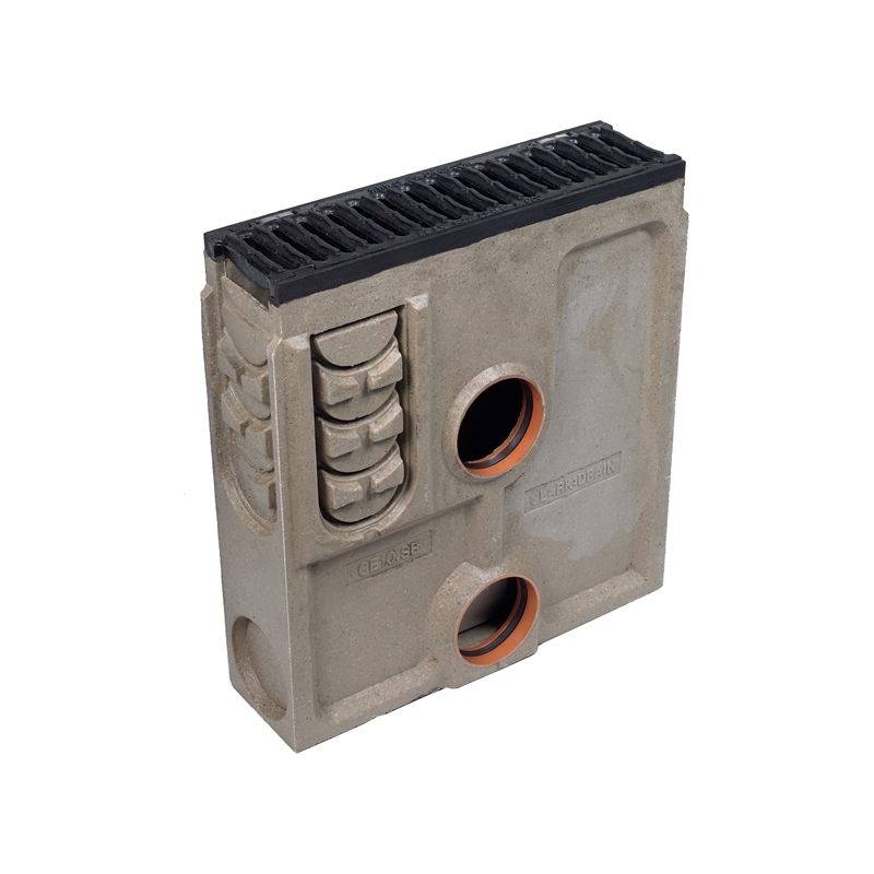 Channel & Grate: Polymer concrete with ductile iron edge rails. Multiple knockout sections and blanking caps offering a variety of inlet and outlet options. 1x 500mm ductile iron slotted grate.