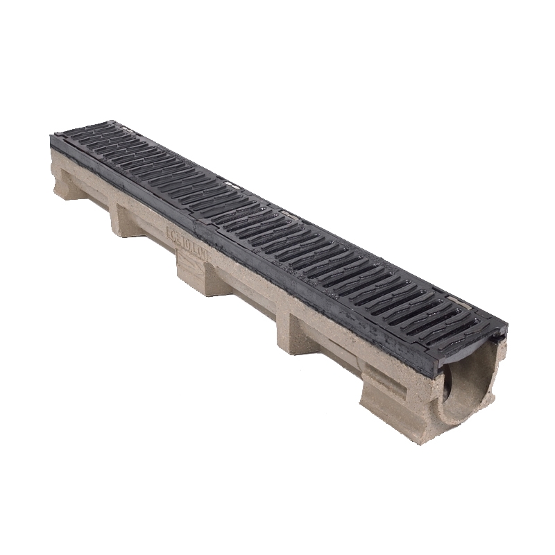 Channel & Grate: Polymer concrete with ductile iron edge rails. Knockout section for vertical outlet (optional). 2 x 500mm ductile iron narrow slot grates