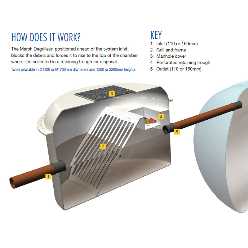 When non dissolvable objects are flushed into the sewer and then into a sewage treatment plant or pump station downstream, it can lead to blockages or worse - possible plant failure. To combat this Marsh Industries has developed the ‘Degrilleur’ – a bar screen which prevents any unsuitable materials from entering the system. The unit has no moving parts and requires no electrics, is available in two capacities, 2000 and 6000 litres, and is suitable for domestic, commercial and industrial installations. The Degrilleur can also be used as a flow splitting chamber in multistream sewage treatment plants or as an upstream trash screen as part of stormwater attenuation systems.