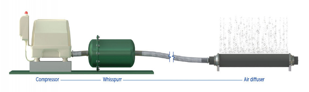 Suitable for all types of compressor including; Bibus Secoh, Nitto and Charles Austen, the Marsh Whisspurr AVR unit is easily fitted inline between the compressor and air diffuser. If space permits, the Marsh Whisspurr unit should be fitted as close as possible to the compressor – preferably, inside the sewage treatment plant.