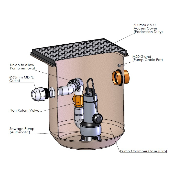 • All systems contain a GRP chamber fitted with high quality pump, float switch, non return valves, pedestrian duty cover and frame.