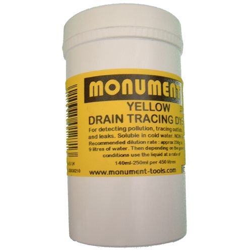 For tracing the direction of flow or to where a drain pipe runs. The recommended dilution rate is one pot of dye (approx. 230g) to 9 litres of water. The liquid is then use at a rate of 140ml-250ml per 450 litres, depending on the ground conditions. One pot (approx. 230g) of drain dye will treat 28,800 litres at 140ml per 450 litres and up to 16,200 litres at 250ml per 450 litres. Weight 0.3 kg.