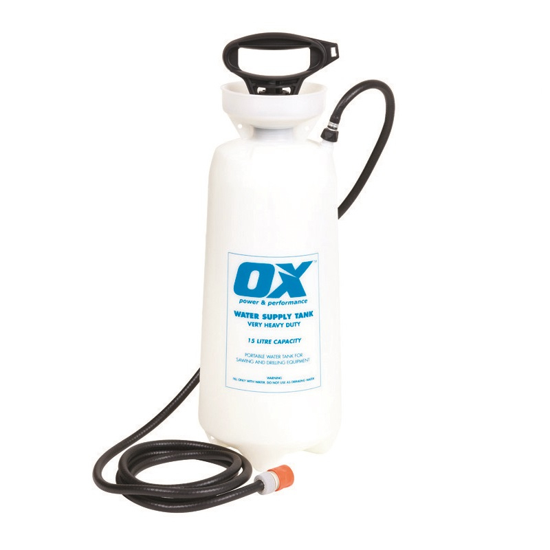 Ox Pro’s Heavy Duty 15L dust suppression water bottle suppresses the dust created when sawing or drilling by spraying water whilst the drilling or sawing takes place.