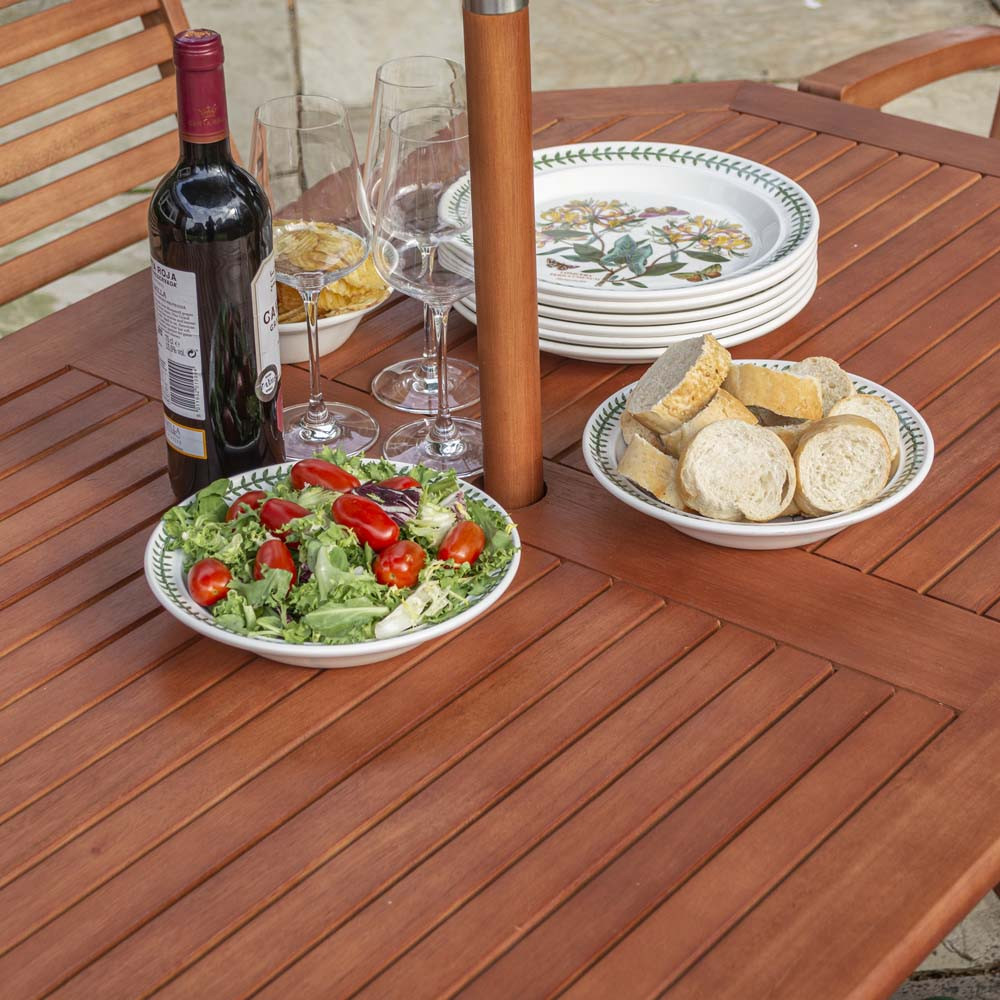 While the Plumley dining table features a central parasol hole to support it when in use, the set also comes with a 15kg circular base. This base will anchor the parasol to the floor, providing added sturdiness.