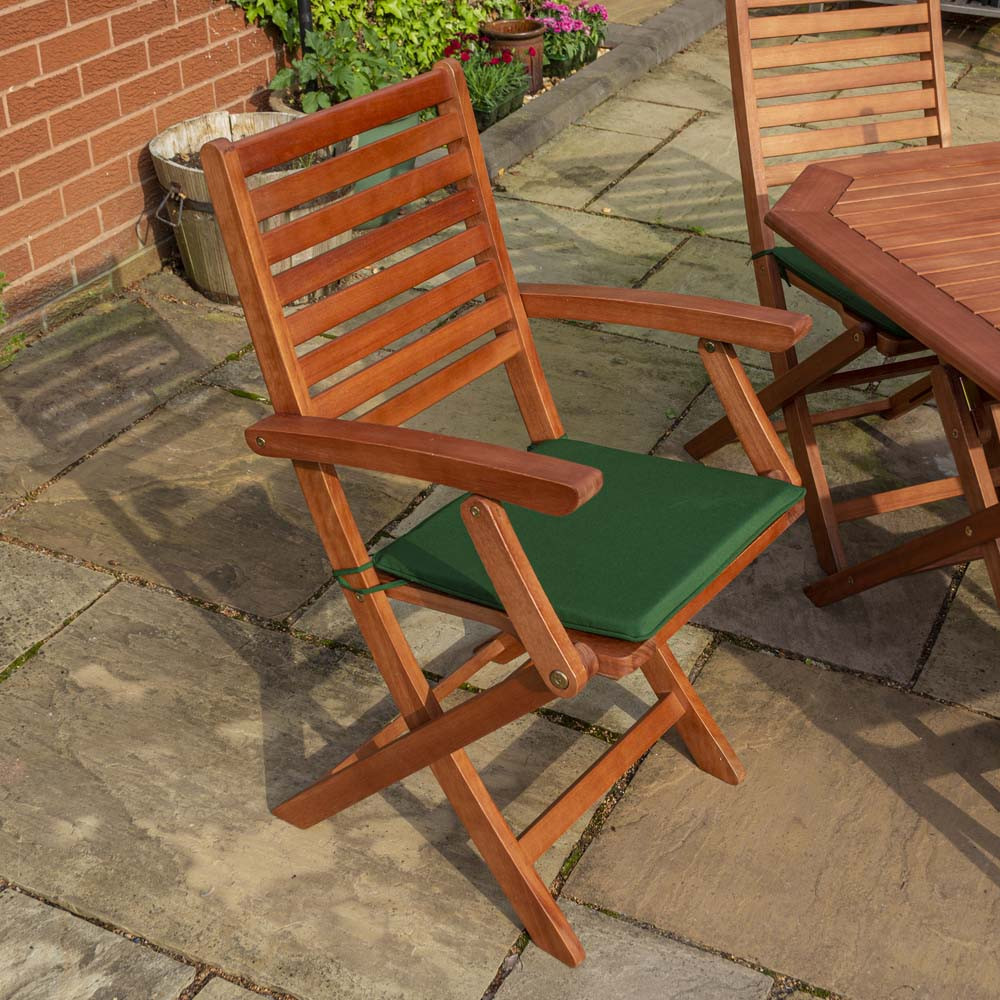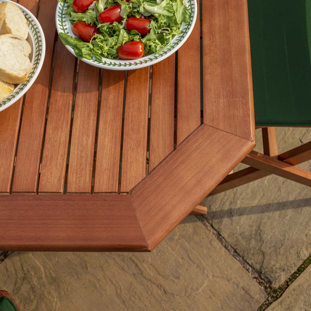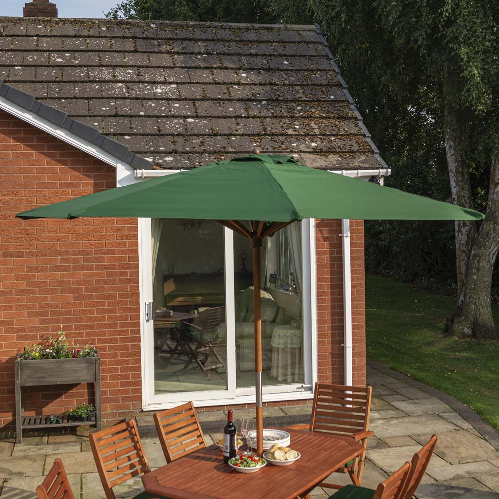 Features & Benefits: DISCON - Rowlinson Plumley 6 Seater Hardwood Dining Set - Green Cushions, Parasol & Base