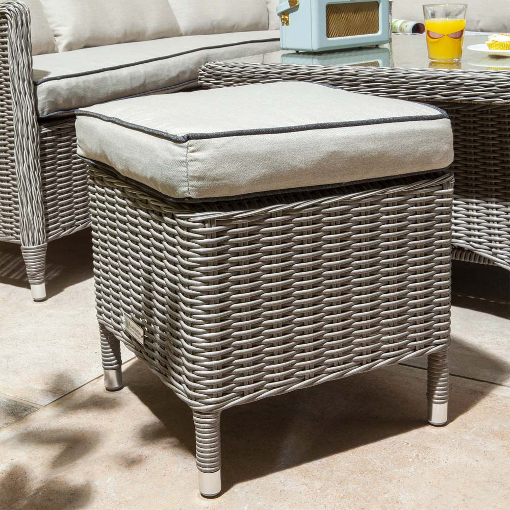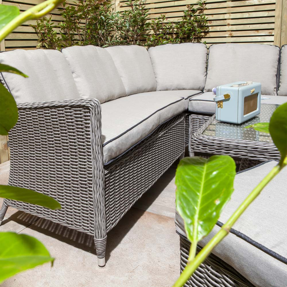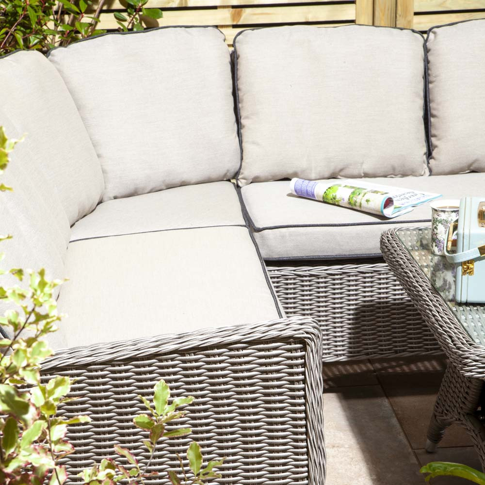 The light grey seat cushions and backrests blend stylishly with the Natural Stone rattan weave and will help you and the family to sit and relax in total comfort.