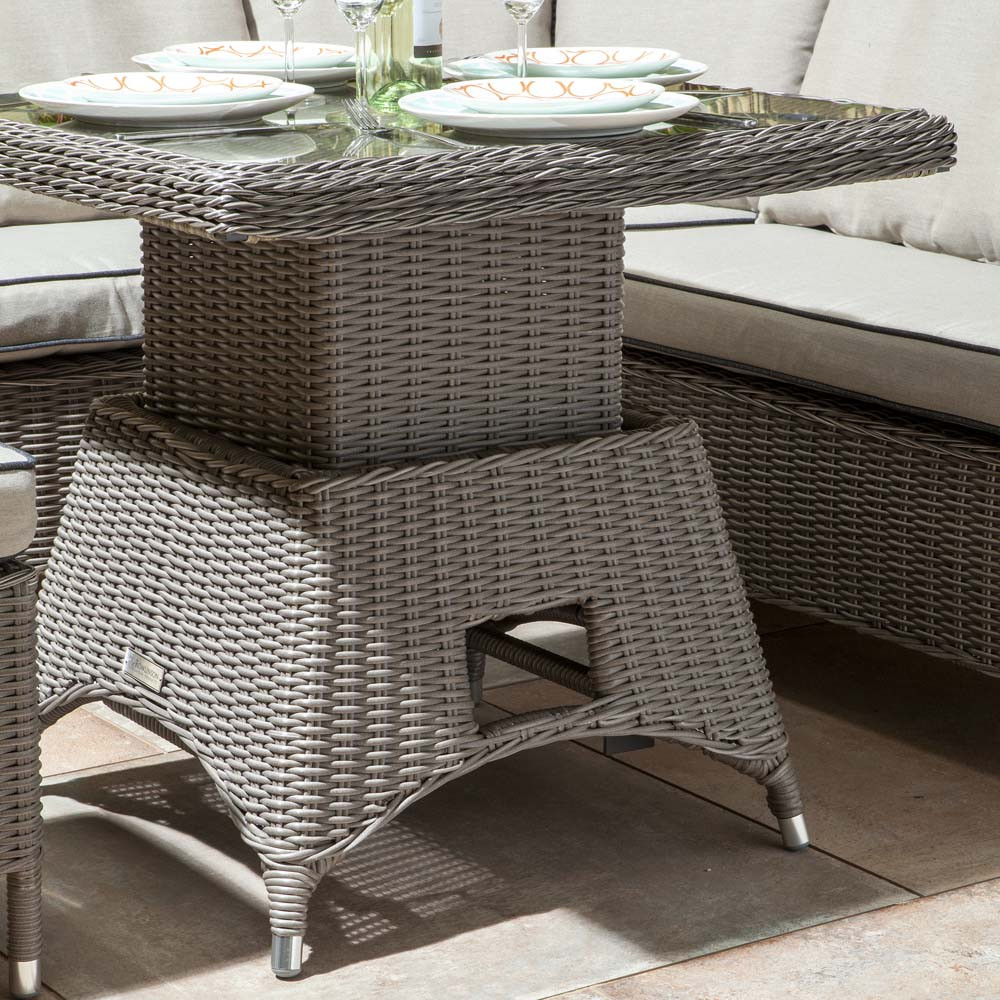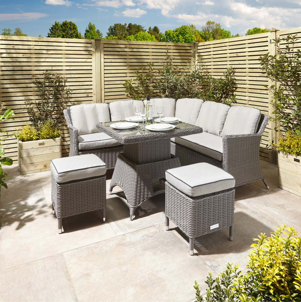 Featuring a large corner sofa, a height-adjustable table and two cushioned stools, this dining set has more than enough room to seat up to six friends or family members, whilst also maintaining a compact design that will not take up to much of your valuable outdoor space.