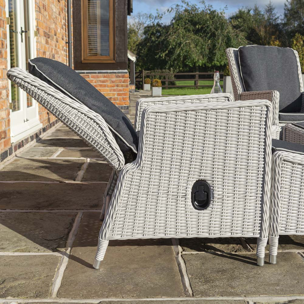 The loungers are fully reclinable, meaning whether you're reading a book or soaking up the sun whilst catching forty winks, you will find the perfect setting to relax. The dark grey Putty Grey cushioned seat and backrest padded cushions will guarantee complete comfort and matches the footstool's padded cushions for a complete and stylish look.