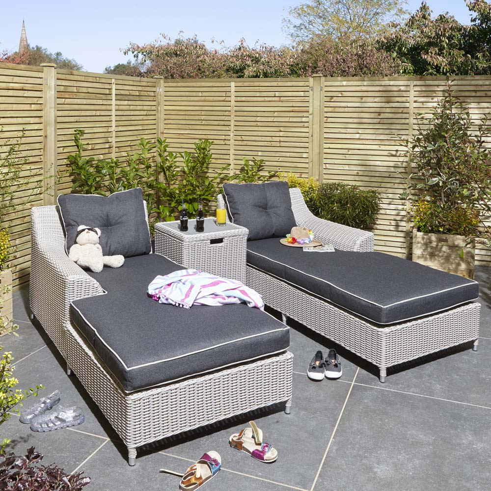 • Stylish and contemporary twin sun lounger set comprising a right and left-handed lounger and a table/storage unit