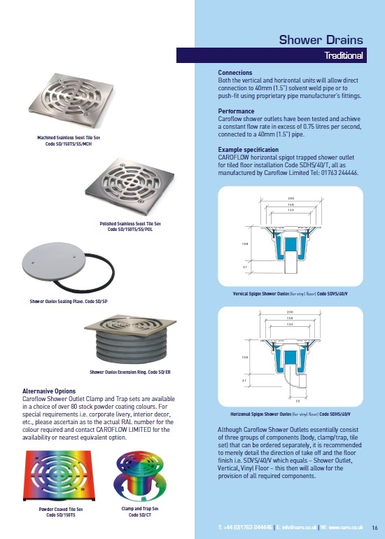 Caroflow Floor & Shower Drainage outlets are manufactured to the highest standards to give superb products that combine superior corrosion resistant materials with an aesthetically pleasing finish and the assurance of performance expected from all CARO products.