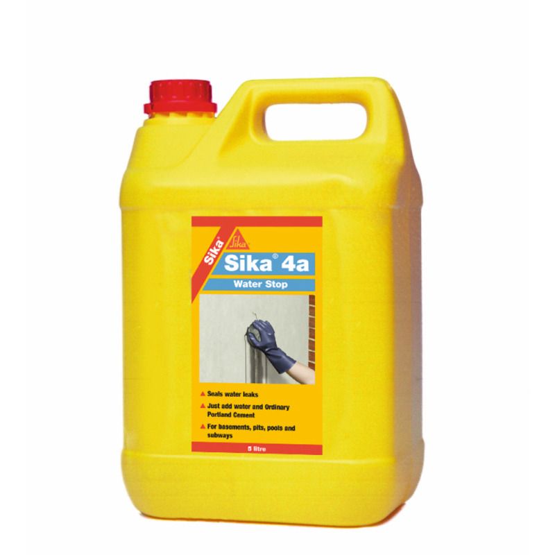 Sika 4a Waterstop - 5 Litres Sika 4a Waterstop is a liquid additive which when mixed with water and cement creates a paste for stopping leaks. Fast setting it is the ideal plug to stop leaks in basements, pits, pools & subways. Suitable for sealing against high water pres... Read More