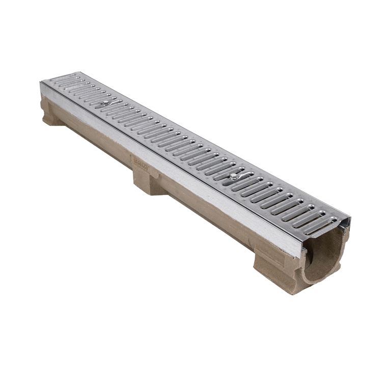 Channel & Grate: Polymer concrete with stainless steel edge rails. Knockout section for vertical outlet (optional). Locking bar slots. 1 x 1mtr stainless steel slotted grate.