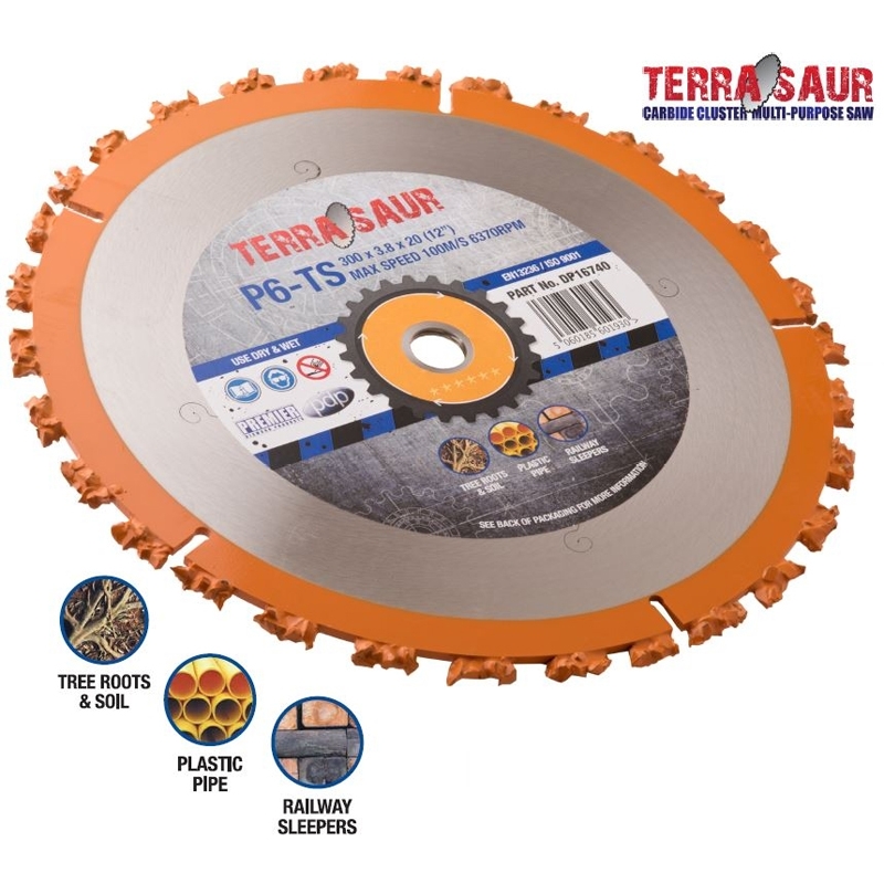 The TERRASAUR is a carbide cluster saw blade that tackles certain applications a chainsaw or diamond blade can't: Tree roots & soil, railway sleepers, small trees & branches, decking, timber fence posts, scaffold boards, fence panels, wooden pallets, plywood, chipboard, PE polyethylene plastic, PP polypropylene plastic, general plastics, rubber, abrasive blocks, flat roofing, tar, screws, nails, flashing & much more… The TERRASAUR is for use on hand held disc cutters and is a Bi-Directional product and does not need to be re-sharpened, you just turn the blade around time and time again... The TERRASAUR is the ideal tool to work alongside diamond blades, chainsaws and stump grinders and is a must have tool for tree surgeons, landscape gardeners, decking installers, utility contractors, farmers, forestry workers, railway contractors, roofing specialists, demolition gangs, local authorities and general builders... See the TERRASAUR in action click on the video below: