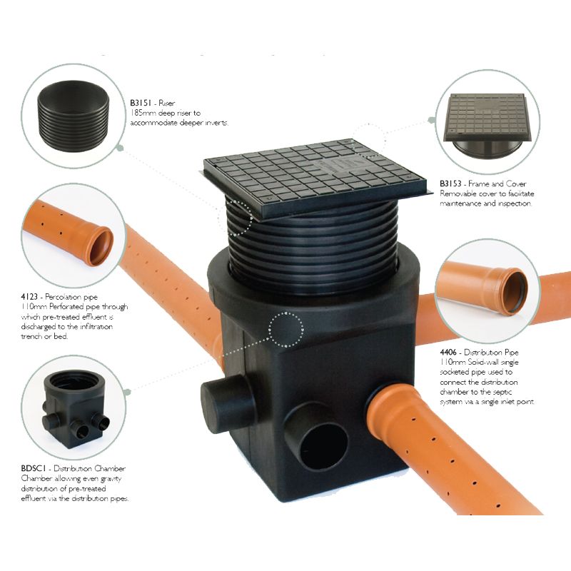 The system's components are available for individual purchase, each fulfilling a crucial role. The Sampling and Distribution Chamber (BDSC1), constructed from resilient polyethylene, assures sturdiness and robustness. The 110mm Single Socketed Percolation Pipe (4406) and 110mm Single Socketed Solid Wall Pipe (4123) are both socket-jointed to meet regulations and ensure flawless connections. The heavy-duty, watertight Riser (B3151) accommodates deeper invert requirements to cater to varying depths, providing a perfect fit. The Frame and Cover (B3153) assembly not only safeguards your system but also minimises the risk of removal, injury or accidents. Plus, the 110mm high frame offers flexibility with its tilt-adjustable spigot.